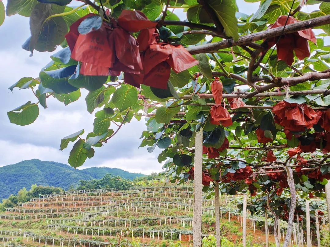 一串串的猕猴桃都被套上了红色的纸袋子,
