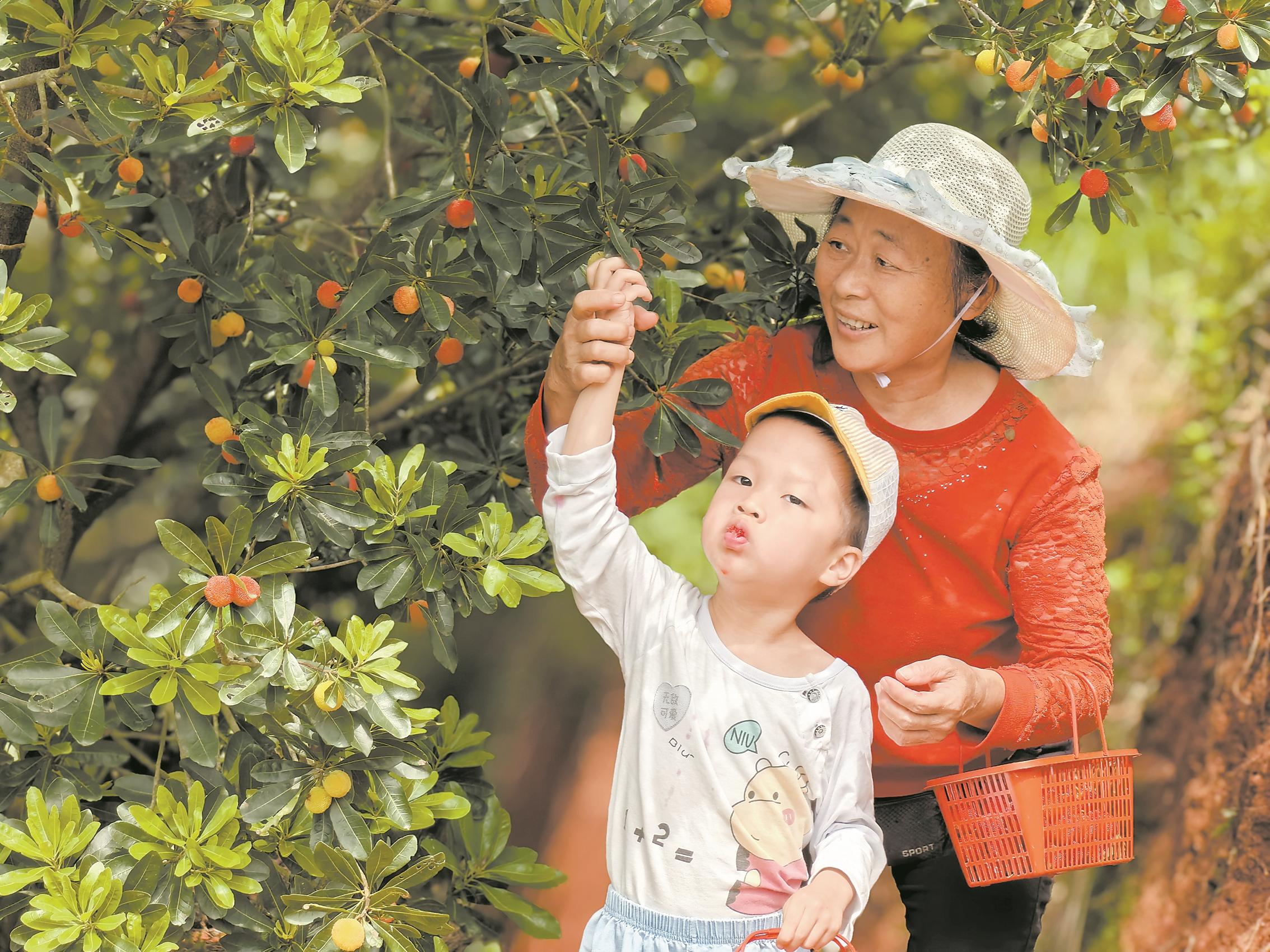 天上琼浆玉液,地上杨梅鲜甜。被誉为“果中玛瑙”的杨梅经过了充沛的雨水和初夏温度的洗礼后,已经红了。记者一走进杨梅园,就被满树的杨梅所吸引,杨梅树上果实累累,青的、黄的、红的、半黄半红的、红得发紫的……密密麻麻地挤在枝头,颇有种争奇斗艳的感觉,长势十分喜人,层层的绿叶也无法遮挡它们可爱的身影。园子里慕名来尝鲜的游客一波又一波,早就闻讯而来的老客户们,很快就摘满了一筐。
